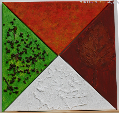 Jahr: 2010 Größe: 4 Dreiecke 40x40 Werkzeuge: Spachtel, Pinsel Materialien: Leinwand, Leimfarbe, Strukturpaste, Gaze, jahreszeitliche Naturmaterialien Techniken: Fixierung mit organischer Textur Geschichte: Die Auseinandersetzung mit den Naturgesetzen; Ausdruck von "Stirb & Werde". Unter Berücksichtigung der Einfachheit.